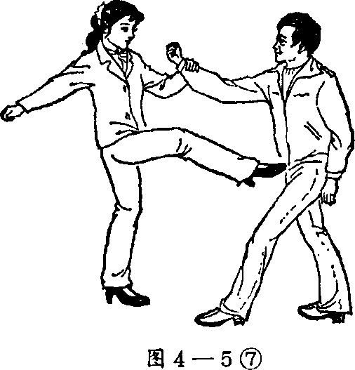 解5左手迅速抓提对方右手腕向左拉带同时右脚面绷平向对方腹裆部猛力弹击力达脚尖左腿略屈膝站立(图4—57)。