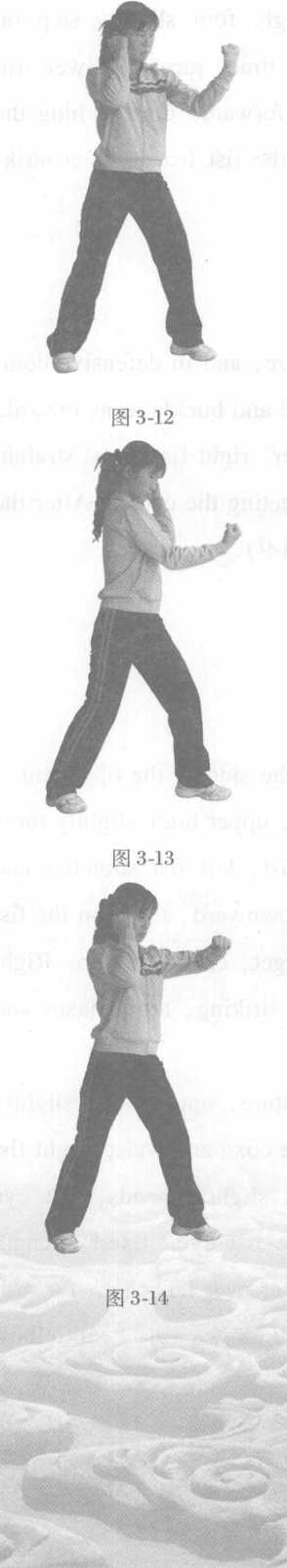 1 左上勾实战姿势站立左脚上前半步,右拳防守,左拳由下向上击打对方下颌或胸腹部位力达拳面拳心向内(图3-12)。