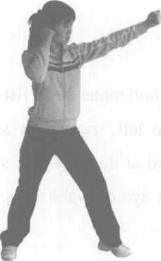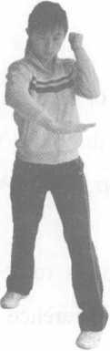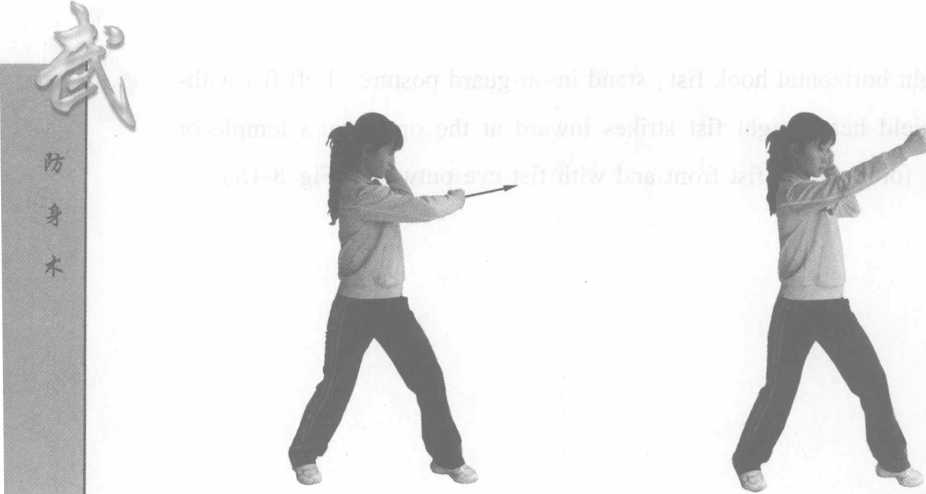 3 左平勾实战姿势站立左脚向左平摆一步右脚同时平摆,左拳由平行向内击打对方太阳穴或头侧力达拳面拳心向外(图3-14)。