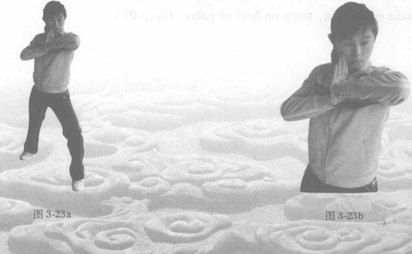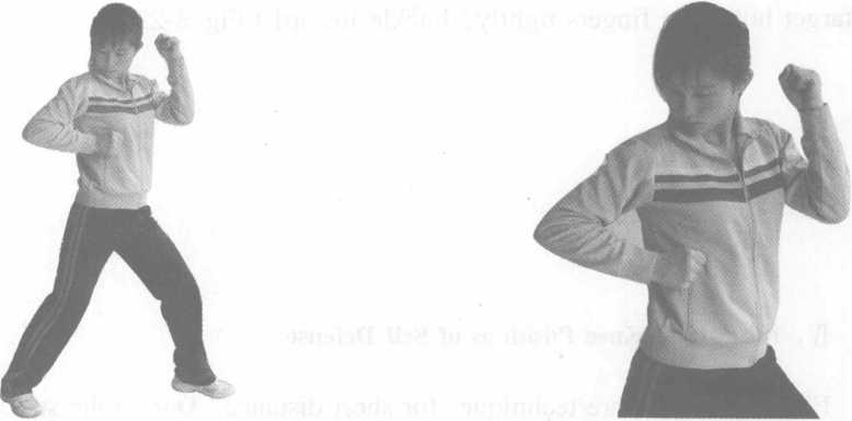 2 反手顶肘手臂略上抬,身体迅速下沉(但幅度没有砸肘大)同时两肘向后顶击力达肘尖。顶肘主要用于攻击背后之敌肋、腹部(图3-24,)。
