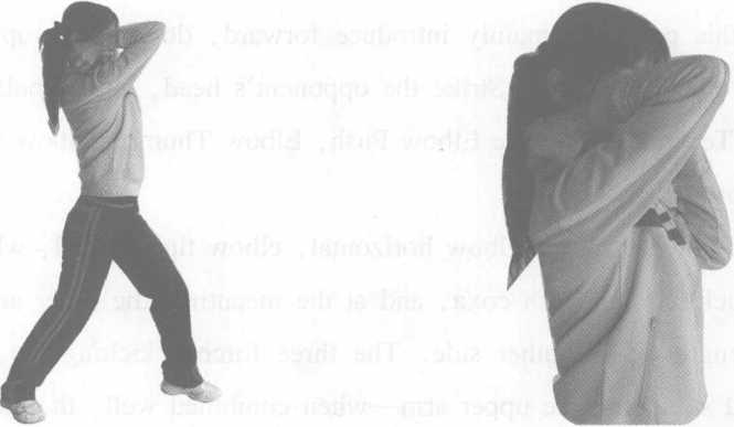 主要介绍向前、向下、向上和横击的肘法打击对方的头部、胸腹部、肋间或腋下。包括顶肘、砸肘、横肘、挑肘。