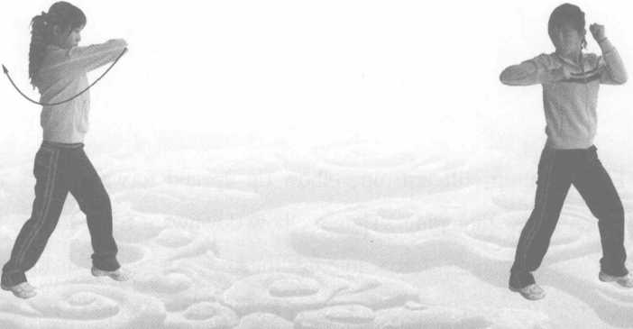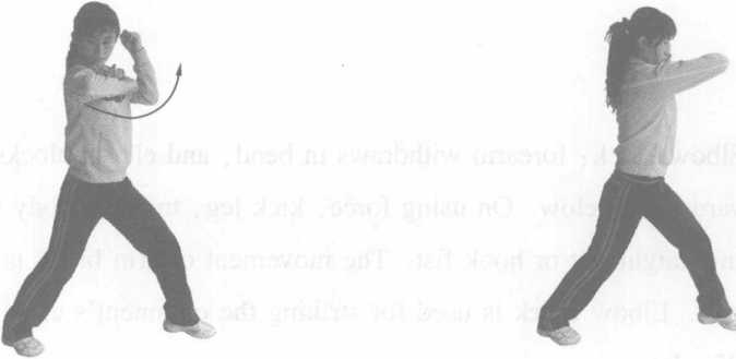 5 横肘横肘动作主要是两股力一是蹬腿二是旋转身体。大臂向前横移用肘尖击打对方。适于攻击对方太阳穴、后脑、耳门、颈部以及胸肋等(图3-27,)。