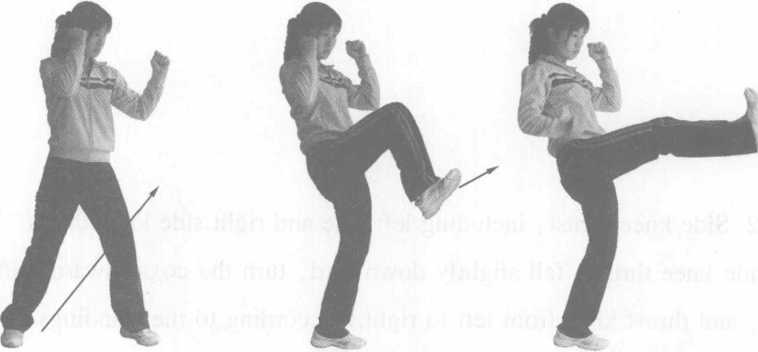 (2)侧踹先转体一腿上抬屈膝勾脚尖由屈到伸向前踹击力达脚跟。低侧踹腿可用于攻击对方胫骨膝关节中侧踹腿可用于攻击对方裆部、腹部(图334,,,)。