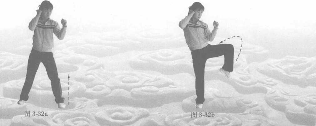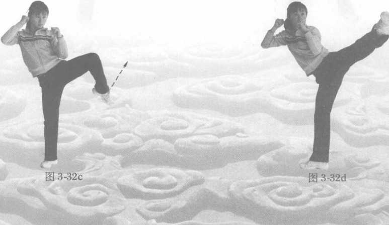 1 蹬腿蹬腿时一腿支撑一腿膝上抬同时向前蹬出。蹬腿要领是脚尖要勾力达脚跟蹬踢对方的胸、腹部。蹬腿时身体不可前后俯仰要脆快有力蹬出后迅即收回(图3-31,,)。