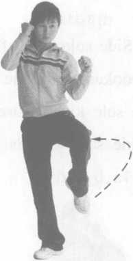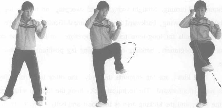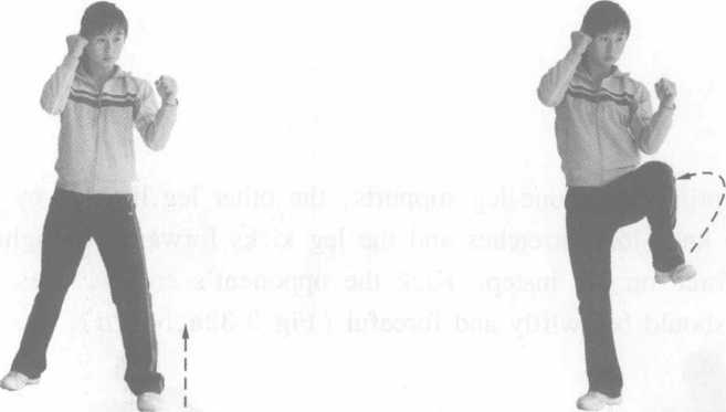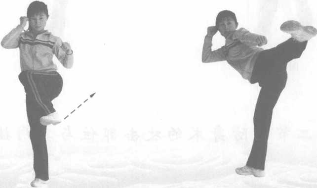 2 弹腿一腿支撑一腿提膝同时膝关节由屈到伸向正前方弹踢出腿。脚背绷直力达脚背弹踢对方的裆部或胸、腹部。弹踢时要脆快有力(图332,,,)。