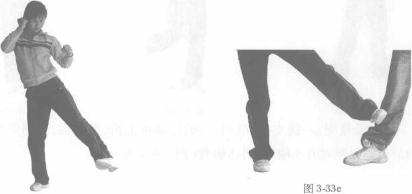 5低鞭腿一腿支撑微屈一腿提膝稍上抬绷脚尖向斜下方内侧45。猛力弹踢对方小腿处力达脚背(图3-36,,,)。