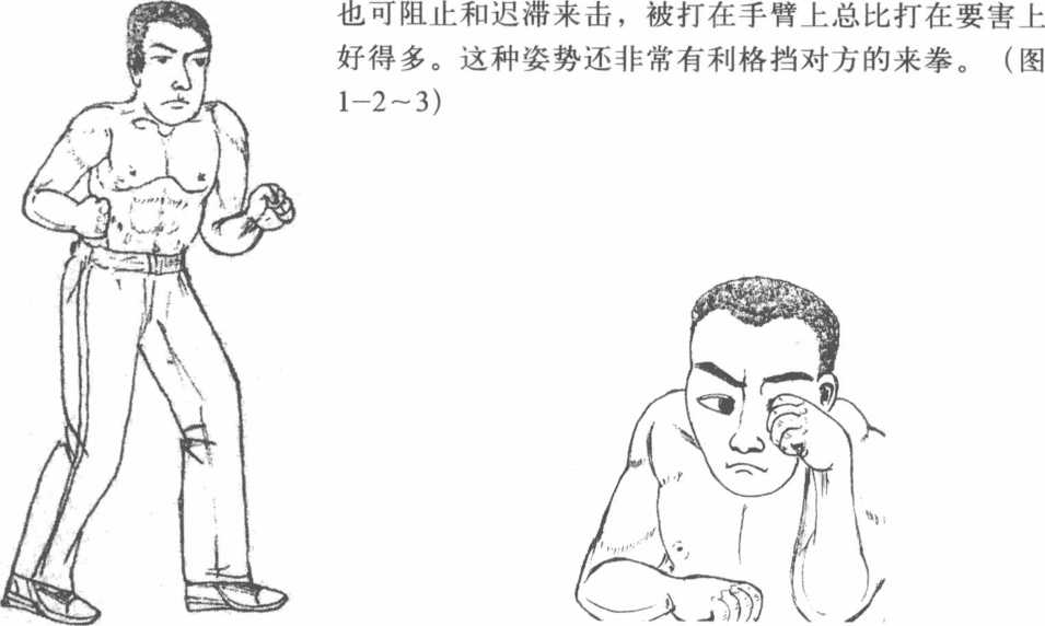 其次手臂架势的摆法可用拳击的前后拳势即格斗界所说的长短手这是上部防御的最佳姿势。这种架势手臂会自然起到护卫的作用可以因此封闭自己的某些要害部位如面门、胃部和肝脏等即使不动图1图1图1—2图1—2