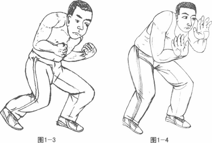 不过你也不必一定要像拳击比赛时握紧拳头也可把手掌展开。这样做可以增大防护面可以最大限度地保护自己的面门但要从掌缝间注视对方的动向随机应变。再收颌弯腰侧身稳立即使你受到脚踢也不可怕。(图1-4)