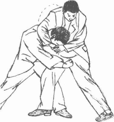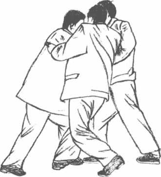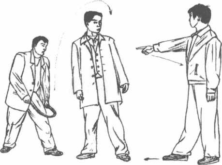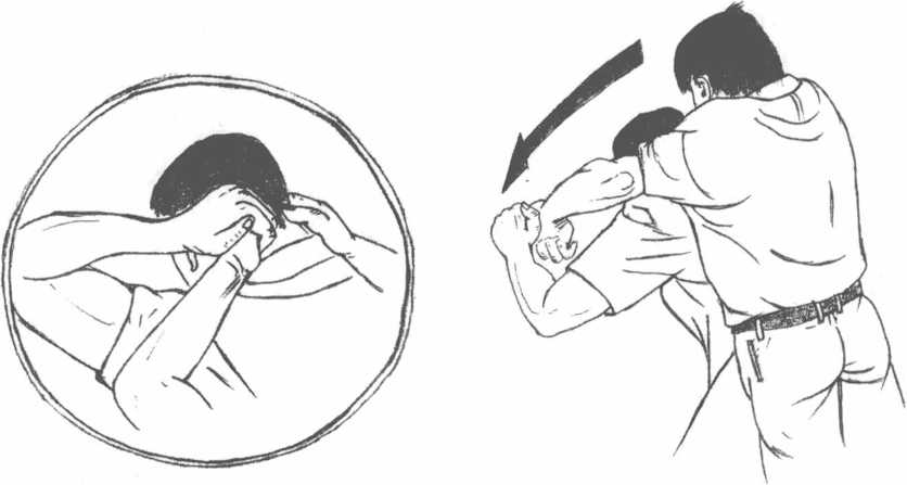 一条绳子套过你的头部正要勒住你的咽喉。你不要回头赶紧将胸前的左手护住颌前挡住勒脖的绳索不要等待上体右旋右手抓住其右臂猛力往左前旋摔而出。(图5-25?27)