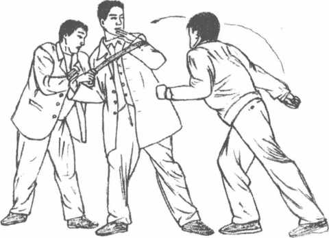 在一条巷道里你突被一人阻住他一面叫骂一面准备动手。遇上这种情景时立即将左手抬起至胸前这叫做你忙我不忙两手护胸膛你慌我不慌两手在中央。