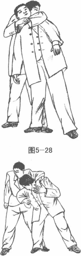 不能停顿紧接着上伸左手扒住恶徒的左手腕背部同时赶紧使用右肘猛力向后撞击恶徒心窝或软肋部。(图5-28?29)