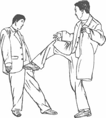 跟踪追击转身乘机再用右脚狼踢恶徒裆部。