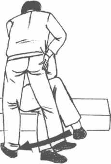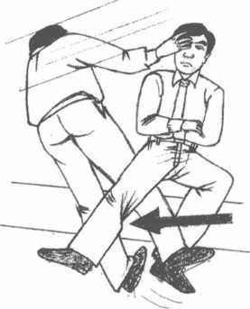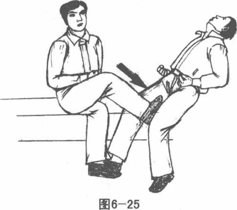 如果你是正身而坐先把自己的脚抵在他踏出的前脚脚跟后面然后以另一只脚用力蹬踢对方的膝关节就这一招立使对方躺倒。对方的脚跟若是固定即能成为用力的支点所以你几乎不动就可跌趴对方。注意此招力大者可把对方膝部蹬折!因而需看情况掌控力度。(图6-24?25)