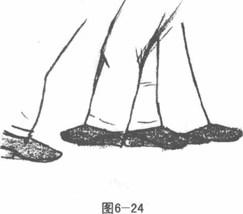 如果你是跷腿而坐就把着地的一只脚放进对方一只脚的内侧同时用跷起来的脚向对方膝关节部位猛力扫击过去对方就会应声而倒。(图6-22?23)