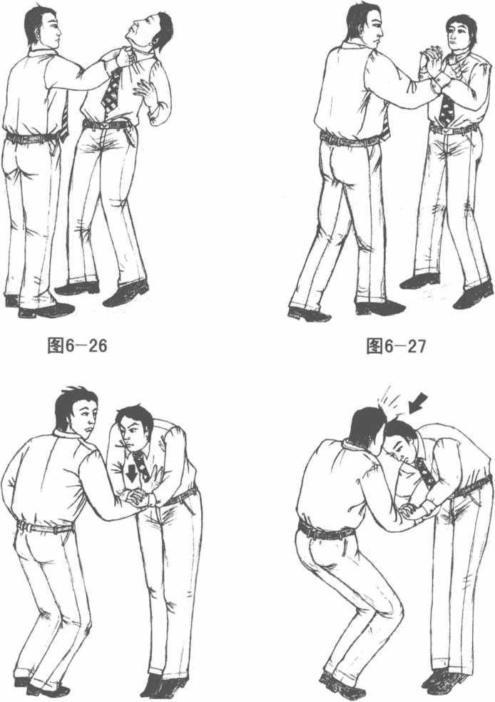 威力的头击——就是用你的头去撞击对方的脸部。你低下的头顺势撞上他的脸一定会给对方造成相当大的伤害一旦击中立可致对方面破血流慌张而逃你就这样自救了。(图6-26?29)