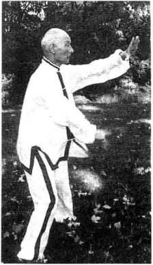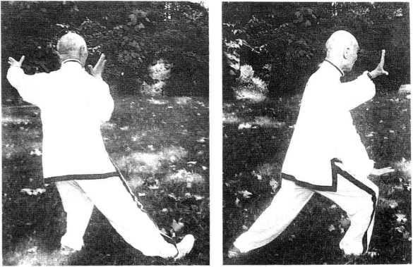 侧,拳心向里,左掌向下划弧落于腹前. 目视前方。(图33—1)