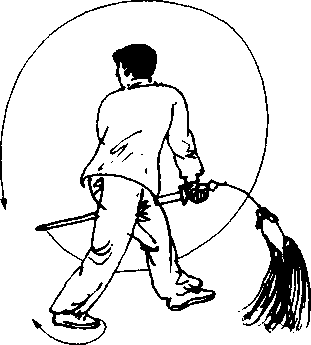 要点:动作要连贯,转身、抡劈动作要协调一致。抡劈臂 要直,抡劈成立圆,力达剑刃。