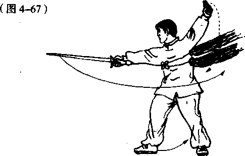 接着,右脚向左上步,右脚随即向左跳步成为交叉步;同 时,右手握剑,向上、向左、向下按压于左胯旁;左剑指附于 右臂内侧,手心向下;目视左方。(图4-66)