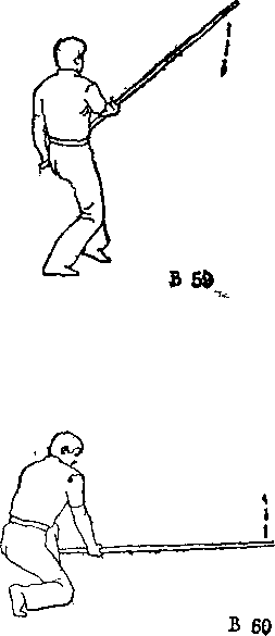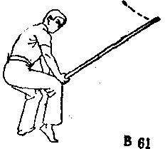 (接上式)左脚向左前 上一大步,右脚跟着上一步 并下跪当左睥跨出,双手 直臂向下,使棍身成水平位 于大腿前。身体下蹲时,双 手门前推棍,他棍梢靠近地 即向前横抖。卧视棍尖(图 B—60> .