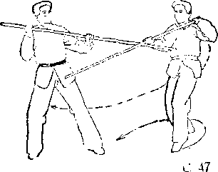 (接上式)甲右脚向后退步,向左转身成左虚步,闪出 乙的控制圈。同时,用棍梢从下斜向上抛击乙的先锋手(图 C —46 ) o