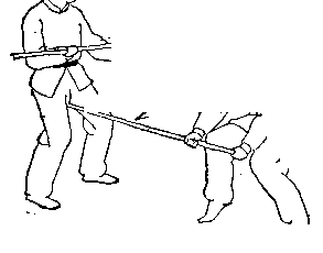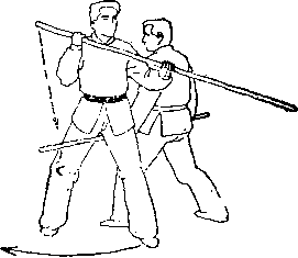 (接上式)甲左脚迅速向 左后绕退一步,身体跟着向左 后转。到乙的左脚后方靠近内 侧处落步,成半马步。同时, 甲的双手向根尖方向滑动。当 转到乙背后时,迅速将棍头沿 身体左侧向后、向下插入乙的 裆中,并向上挑击乙的下阴