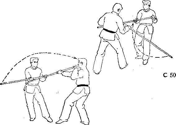 (接上式)甲顺势右脚向 左前方斜上一步,向左转身, 左脚跟着向身边移动半步,成 左虚步。同时,用棍梢横扫乙 的左胁(图C—50) o
