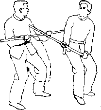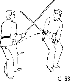 乙右脚向左前迈步,身向 右转,同时,用棍梢向上、向 右挑转甲的棍梢,使自己的棍 由底棍变为面棍,横压在甲的 棍梢上(图C-53)。紧接着, 乙左脚向前上一步,向右转成 半马步。用棍头横扫甲的右胁
