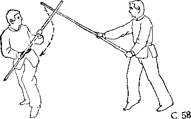跟着过一小步,成右虚步。同时,用棍梢向下击乙的头部 (图C—57)。