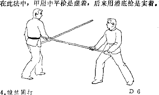 甲用中平枪向对方胸膛冲刺(图D—1),对方右闪用 扣杀棍法(图D—2) o甲急沉棍尖,左脚向左侧横过一 步,右脚跟着过步,仍成右弓步,闪出对方的控制圈。同时, 双手先向下、向扃拉棍,在过右脚时,双手再向前推棍,用 棍尖冲刺对方的右胁(图D— 6) 中