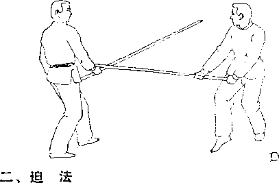 在此法中,甲边步向前,用流水棍迫入,将乙棍梢推迫