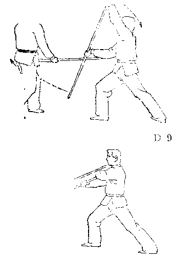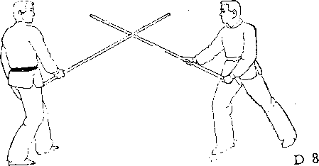 甲用中平枪向乙胸膛冲刺(图D—1),对方右闪用打 杀棍枪刺法,棍已响(即乙棍已击到甲棍,下同)(图D-8 )。 这时,甲要用变化再攻已来不及,只能用迫法。因为对方击 低甲棍后,必处迅速出棍向前刺击。此时甲若变棍用潜底枪 或偷底抛手法,乙棍可乘甲棍松开之机刺去,使甲救护不及。