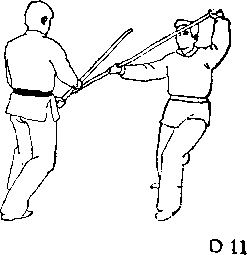 甲用中平枪向乙胸膛冲刺(图D—1 ) 9对方右闪用扣 杀棍法,甲棍被每低。甲左脚 (后脚)急向左前方上一大步, 右脚随着在左脚后方跟上半 步,成左弓步,闪到乙的右侧 前方(出圈)。同时,双手用力向 右前方、向上推棍,使棍梢沿乙.棍的底面向前、向上推迫,并削击对方的先锋手(图此法中,甲对乙棍的推迫与削击是同时进行的,一边将 对方的棍梢迫开,一边顺对方棍的下缘向前、向上滑动, 削 击对方的先锋手。
