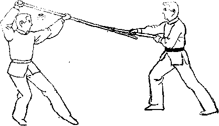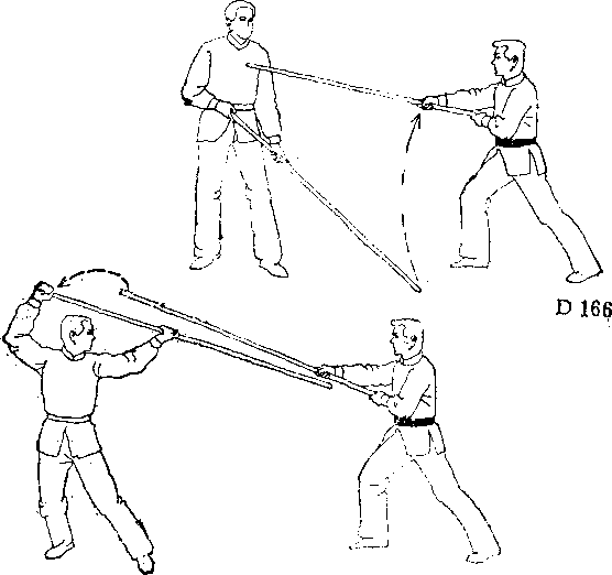 若甲举棍上托阻架乙棍(图D—174),乙乘对方下路 空虚之隙,急上左步,向甲迫近,同时用棍头向下挑阴(祖 D—175)。此式叫“偷龙转凤”。