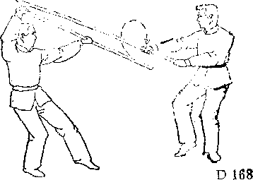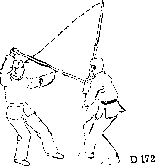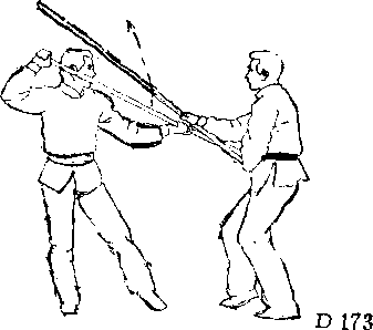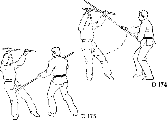 棍剌乙胸部,乙急向左侧 前方闪走,逼步向前。同时 顺甲向上抛棍之势,左手急 沉棍头,右手屈臂拉棍把到 身边,使棍直立在身体右 边Q接着向右转身,用棍掩 护自己的门户,将甲棍推迫 出圈外,使对方发不出攻 势(图D—172) o然后,用 夹衫棍向前打击甲方头部 (图 D —173)。