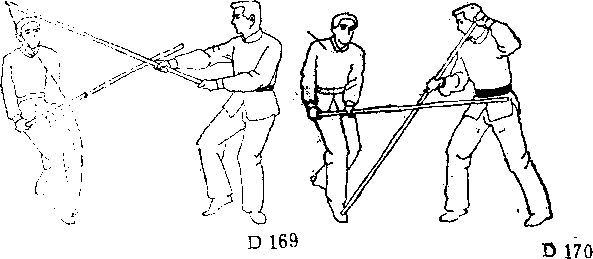甲迅速向左侧闪身移步,用挑翻草棍法,起棍削击乙的 先锋手(图D—169) 0当甲棍一压到乙棍,乙迅速顺势向下 沉棍尖,向上提高棍头,同时向右侧前方迫进到对方身边, 以插脚枪插对方前脚背(图D-170)。