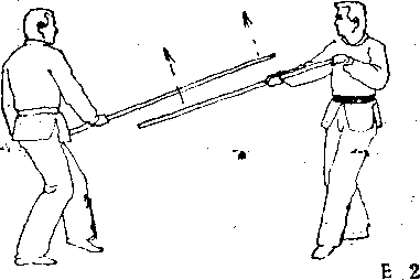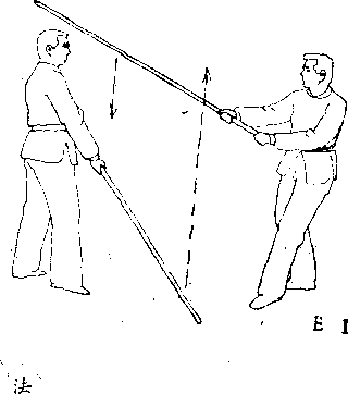 甲立潜龙势,乙出棍向对方头上劈落(图E—1),甲 向右闪,以杀击冲刺法,企图击落乙棍后进步刺击。乙以顺 势挫敌法应战。乙棍尖顺势下沉,避过甲棍的力点,以沉底 半边月,从对方的棍底抛击其先锋手(图E— 2 )。甲向上堤