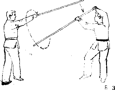 此例中,甲乙双方都在棍将到而未到时变棍,互相对 攻。如果双方旗鼓相当,可以循环演变无穷。若双方棍术精 湛,深知该棍法真谛,对攻起来,甚至听不到碰棍的响声.