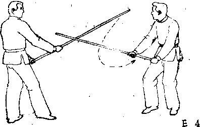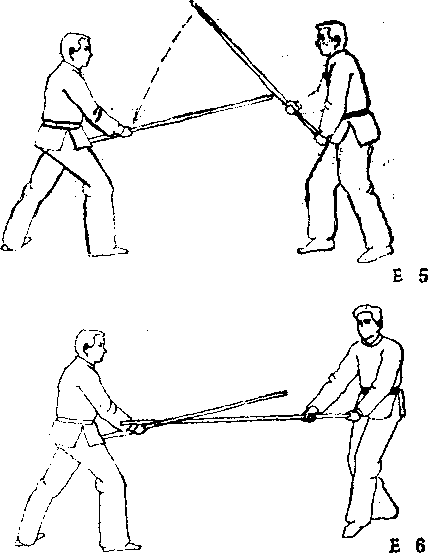 棍避过乙的抛击,同时向左侧过步,举棍击乙头部。乙迅速 向左侧生门闪避出圈,同时在甲棍向上提时,乙棍跟着一起 向上提(图E—3),覆甲棍向下劈时,乙向右转身,翻腕转 棍,使棍由在甲湛底曾变为在上面,并迅速沿着甲棍向下削 击甲的先锋手(?E-4) O甲迅速向后拉棍,同右侧生门 闪避出圈,准备以潜底枪刺乙左胁(图E-5 )时工急速向 右侧生门闪避,向时以左行者棒击甲先锋手(图E—6)。