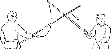 此式是以千字棍搏千字棍,若彼此力点碰撞,虎口容易 被震伤。乙发棍后见对方以蛮力劈击,则应迅速手转阴阳、 沉棍顺之,不与甲的力点相碰。这是对棍诀“刚在他力前, 柔乘他力后”的应用。等甲劈棍的力将尽,未变招时,乙棍 乘虚上削。练习时,几个动作要连贯协调°先用阳手刚劲劈 杀,接着转为阴手以柔劲顺消,再以刚劲逆削。这样,阴阳 顺逆连续使用,攻守贯连,使敌无隙可进。