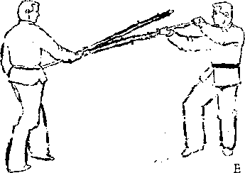 发棍向甲头左侧劈落,对方右闪以千字棍 劈回(图E —24) o乙顺着对方下劈之势,迅速沉低棍尖、 提高棍头,由阳手握棍变为阴手握棍,同时向左侧前方斜上 步,发棍沿对方棍的底面向上削击甲先锋手(图E —25)。