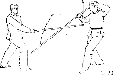 甲横棍向乙左胁扫来,乙急右闪以提拦棍拦阻(图E 一 26) 0乙以静待动,甲向左侧过步,向上举棍击乙头部。乙 棍则紧紧提住其棍,跟着甲棍一起向上提高。等甲棍要从上 向下打击乙头部时,乙及时移步转身,翻腕转棍,使棍由底