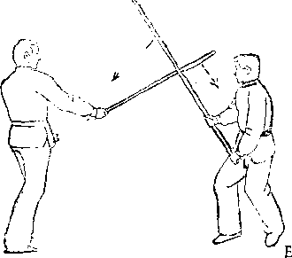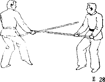 棍转变为面棍,仍紧紧粘住甲棍(图E—27),然后随甲向下 击之势,沿着甲棍向下削击对方的先锋手(图E-28)。