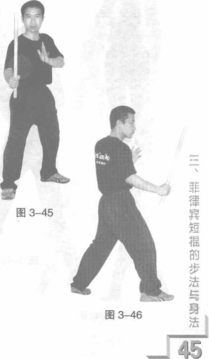 明菲律宾短幅篇解明菲律宾短幅篇解第二种前脚环绕步,由开放式格斗站姿开始,左脚 向左上移动一步,身体顺时针右转,同时右脚围绕左脚 转动90。后落地。(图3-47—图3-49)