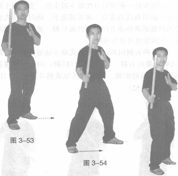 第二种左侧闪步,由开放式格斗站姿开始,左脚横 向左移一步,右脚向左快速移动跟进相同的距离,到位 时还原成格斗站姿。(图3-53—图3-55)图 3-55在进行侧闪步移动时,要注意保护好头部,即头部 要随步动,使其偏离对手攻击的范围。虽然运用侧闪步 可以快速移身到对手内侧,但是一定要记住,在实战