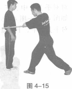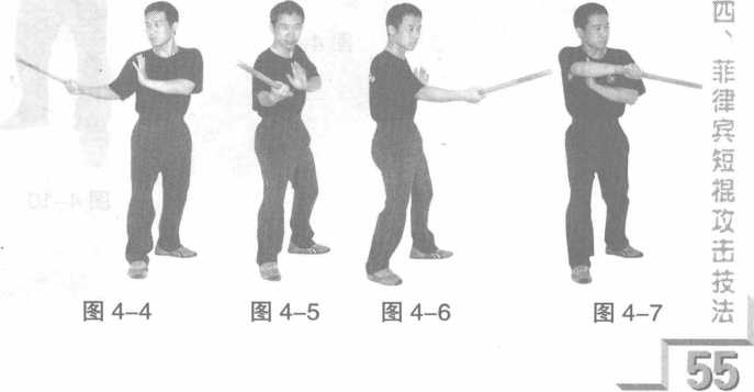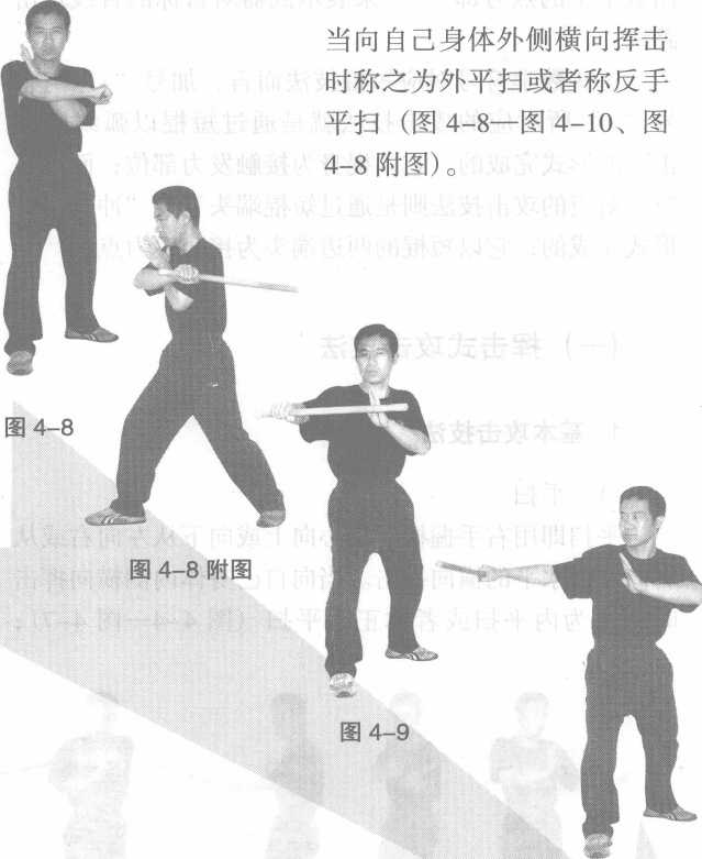 平扫即用右手握棍,手心向上或向下从左向右或从 右向左做水平的横向挥击。当向自己身体内侧横向挥击 时称之为内平扫或者称正手平扫(图4-4—图4-7);