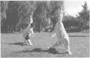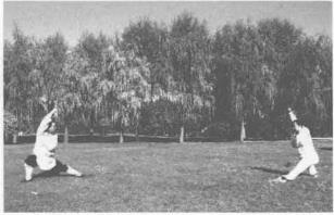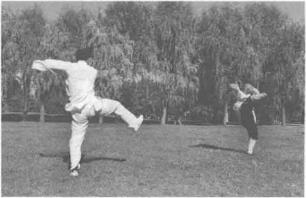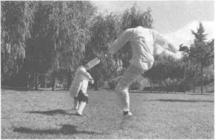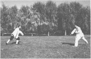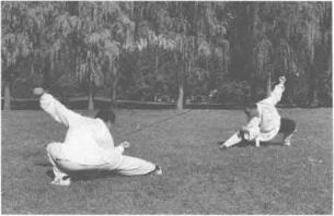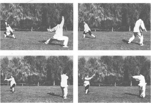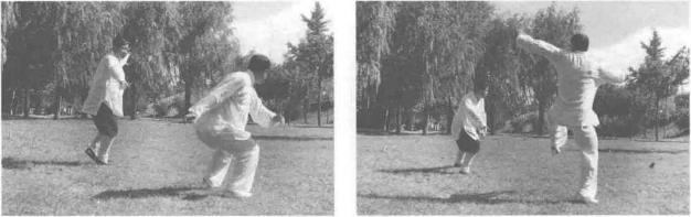 双方迅速以撤法后撤而后甲乙双方双摆莲腿接扑腿势。
