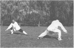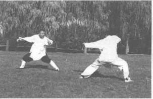 甲乙双方右腿向右前方迈出右拳变掌向下画圆至身体右侧左拳变掌向上经头侧画圆至身前左腿同时提膝向身体左侧横跨一步,成大势。目视对方。