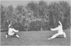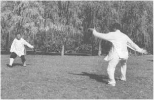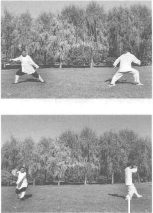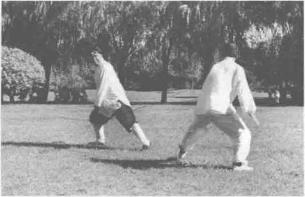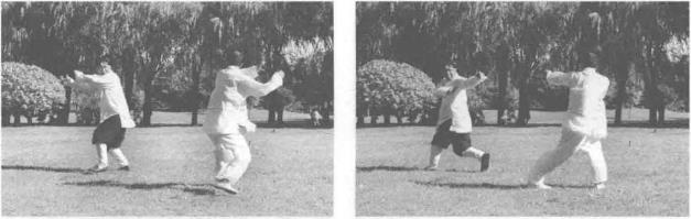 甲方上步变顺势乙方撤步穿掌变顺势。双方对视。