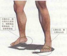 图2—1一4图2—1一4以左前势为例两脚前后分开左脚在前脚尖稍向内扣右脚在后脚尖指向右斜前方脚跟提起稍