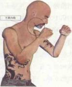 的平衡头部就必须保持一定的姿势头部的正确姿势应该是端正、稍向下低下颌内收(图2-1-8)。这样做的目的在于保护下颌与咽喉同时可以使颈部肌肉保持一定的紧张状态使面部、前额在遭受外力打击的情况下有良好的支点。下颌内收的同时注意咬紧牙关双唇自然闭合。面部表情沉着自然切勿暴露自己的内心活动与情绪变化防止对手从面部表情中发现自己的攻击意图。双眼注意观察对手的上体、肩部并用余光注视其全身动作。切忌眼睛仅死死盯住对手某一局部这是格斗中的致命错误也是初学者容易犯的毛病。
